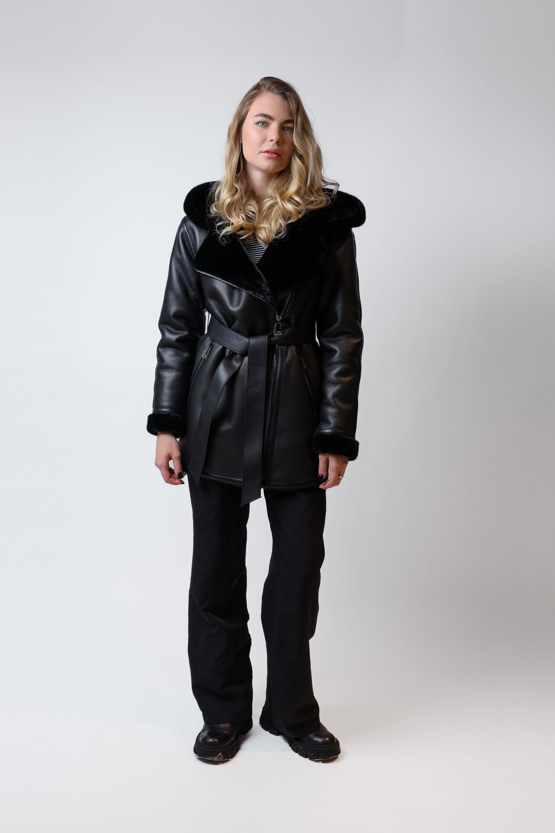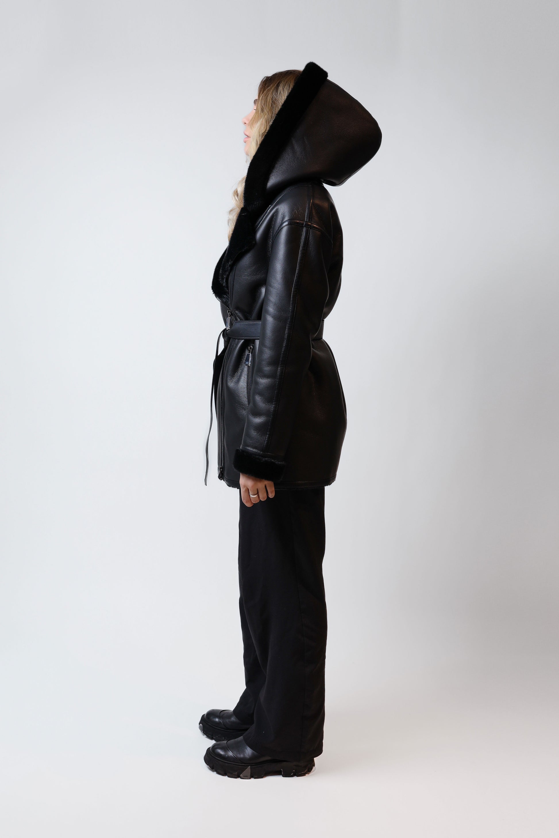 Short Faux Shearling Coat with Belt & Hood – Black Elegance